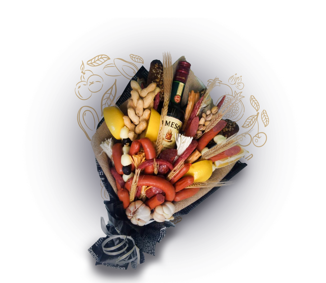 БУКЕТЫ ИЗ КОЛБАСОК/РАКОВ/СЫРОВ мы рекомендуем хранить не более 12-ти часов, для продления срока годности можно снять продукты со шпажек и поместить в холодильник.